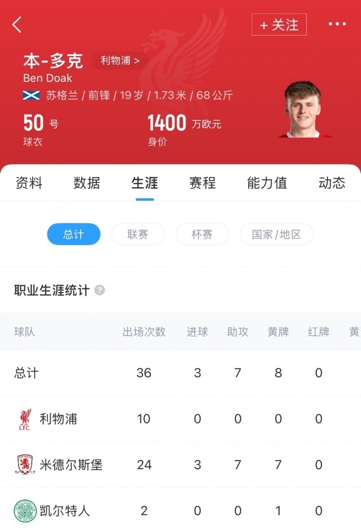这位苏格兰小将16岁便加入利物浦青训体系,并在同年获得克洛普提拔完成一线队首秀,不过代表红军出战的10场比赛中尚未取得进球或助攻。