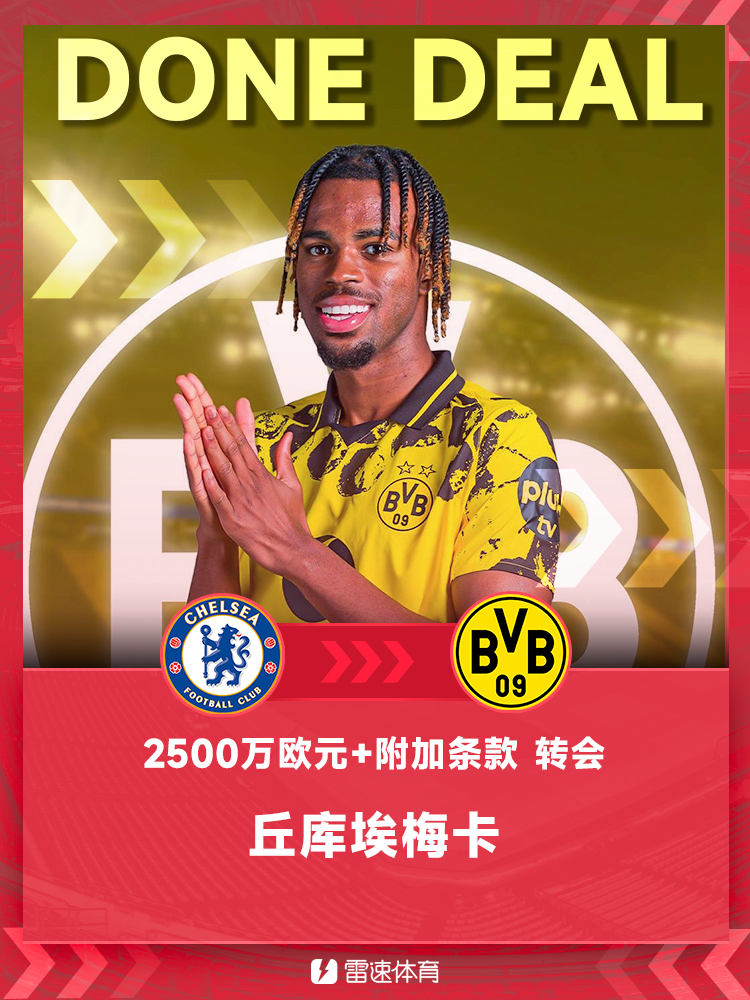 雷速体育8月25日讯 官方消息,多特蒙德签下21岁切尔西中场丘库埃梅卡,据悉转会费为2400万镑+附加条款,他将与球队签约到2030年。