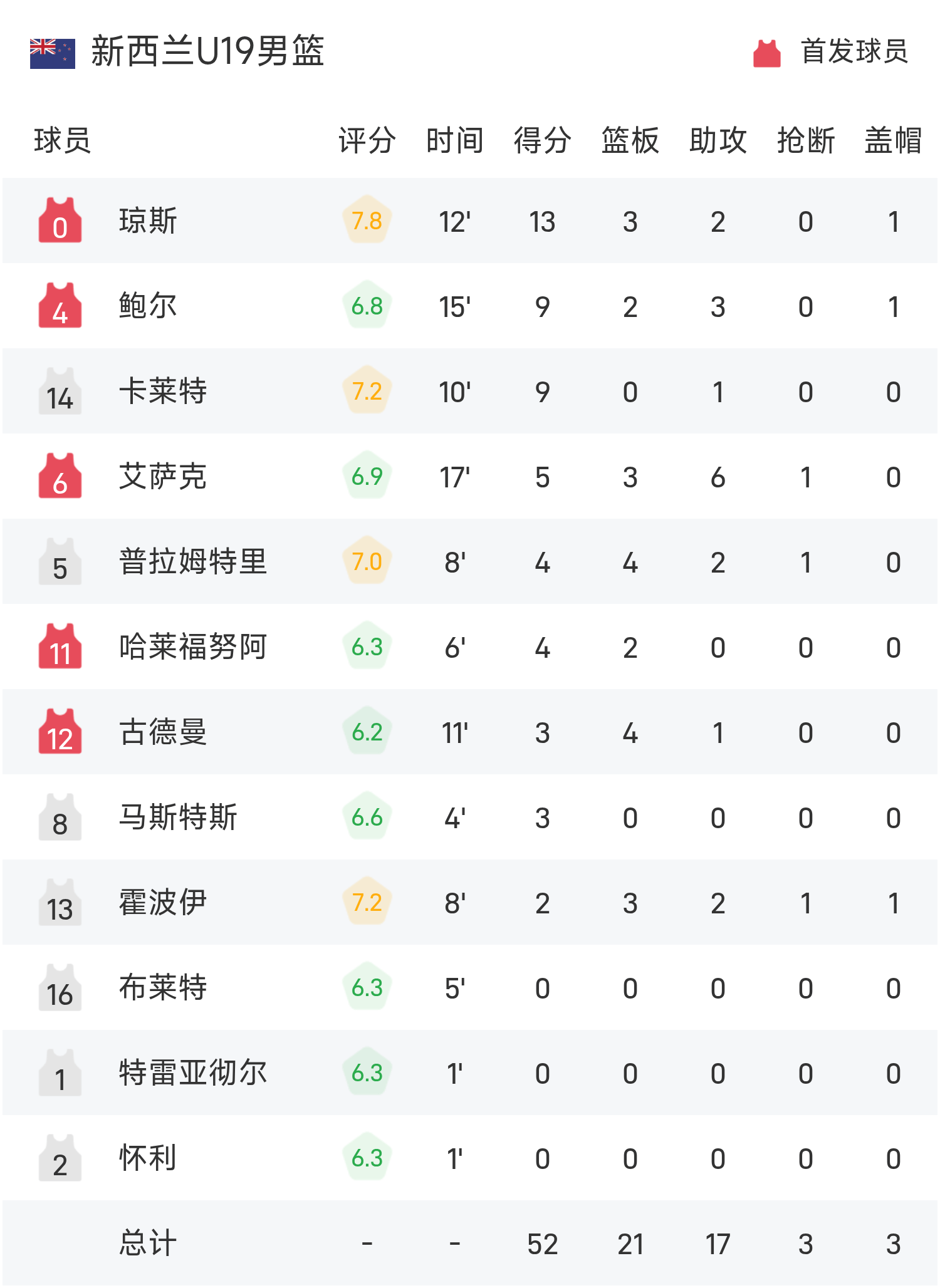 琼斯砍下半场最高的13分3板2助,率领新西兰U19男篮暂时取得领先。