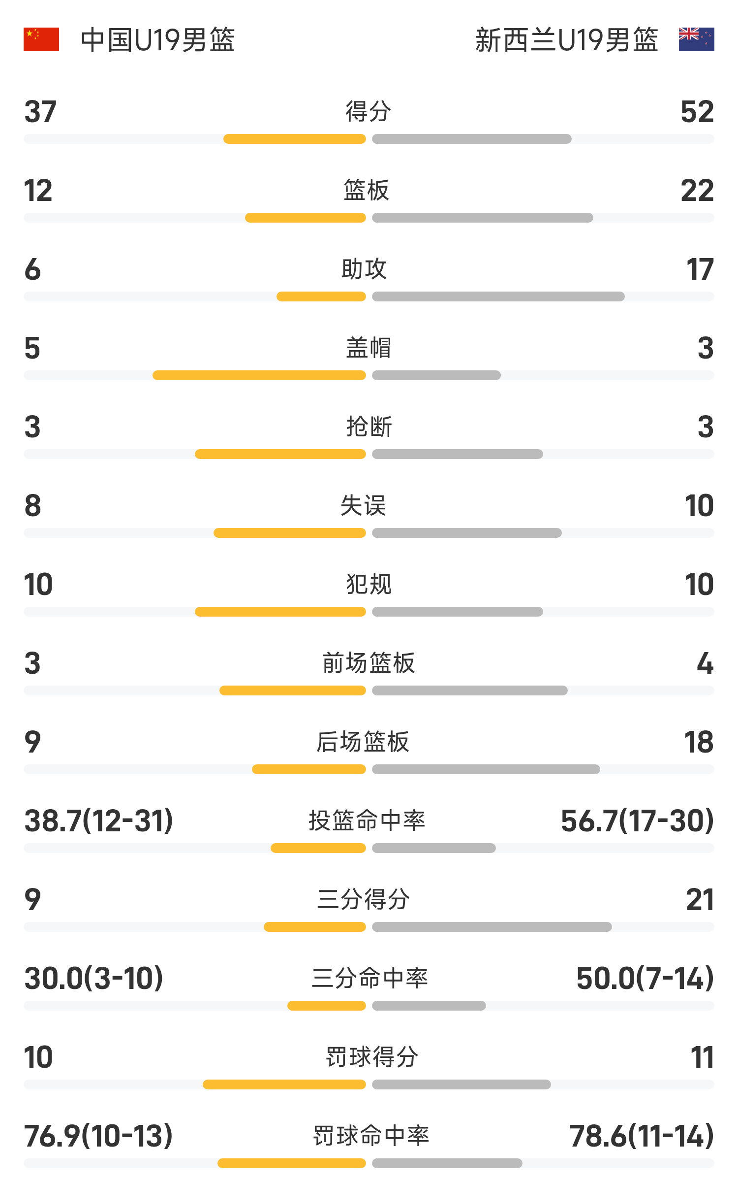 双方半场战罢,新西兰U19男篮52-37领先中国U19男篮。