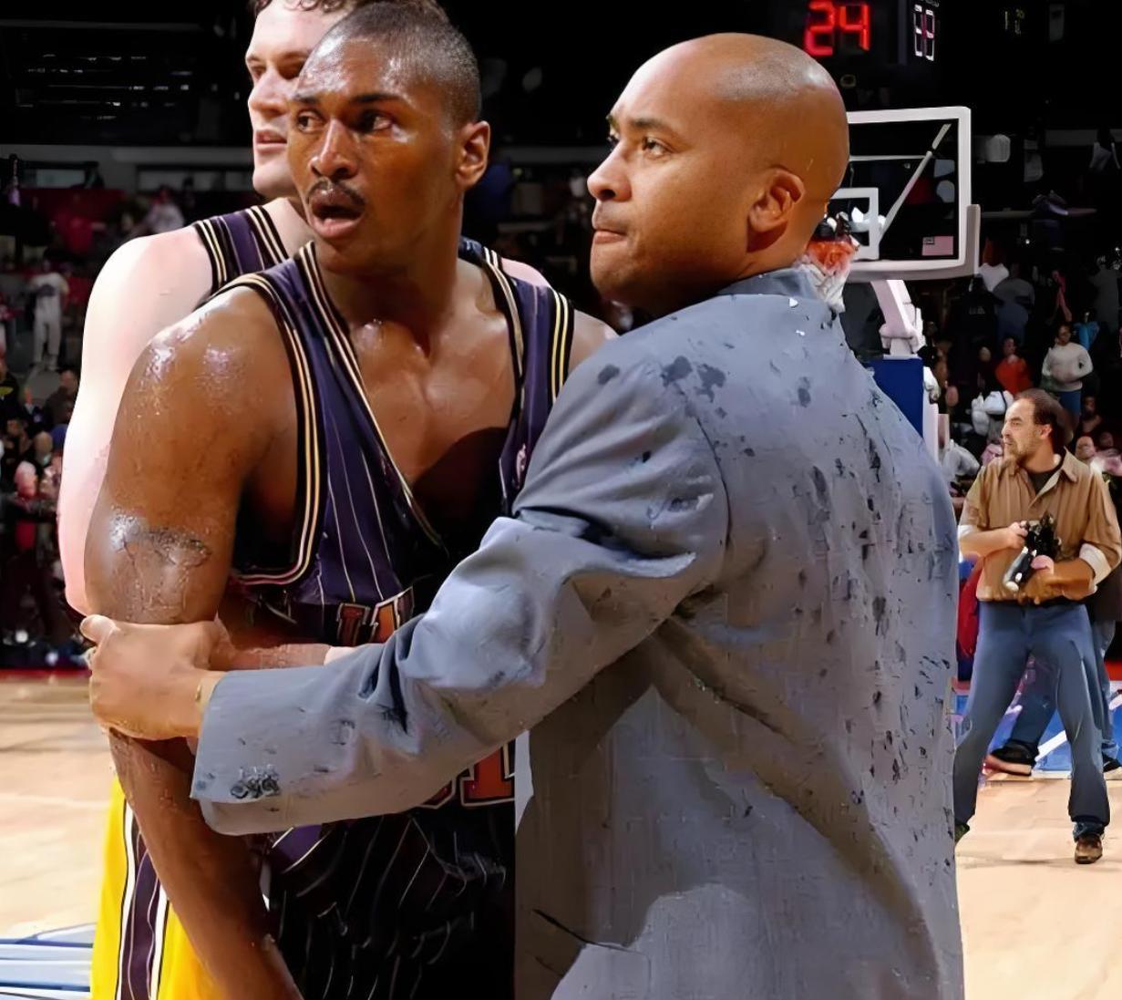 年轻时的阿泰,在一次队内训练中,因为和乔丹抢球发生争执,直接一记重撞把乔丹的肋骨撞断了两根 —— 要知道,那时候的乔丹已经是联盟的 “精神图腾”,阿泰却丝毫没手下留情。进入 NBA 后,他的 “暴力行为” 更是变本加厉:2006 年对阵火箭,他在防守哈登时,一肘击中哈登的太阳穴,哈登当场休克,被抬出赛场;2004 年的 “奥本山宫殿事件” 更是 NBA 历史上最黑暗的一幕 —— 他因为被球迷扔饮料,直接冲进观众席打球迷,还带动队友一起参与斗殴,最终被禁赛 73 场。