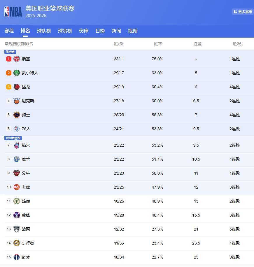 绿军29胜17负,猛龙29胜19负,尼克斯27胜18负,3队之间的胜负差只有1.5场,第2之争非常激烈!
